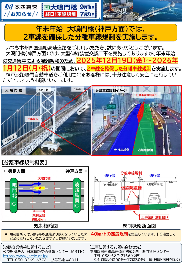 由于需要更换鸣门城方向车道的伸缩装置,新年假期期间将实施单独的车道限制,以确保两条车道通行。